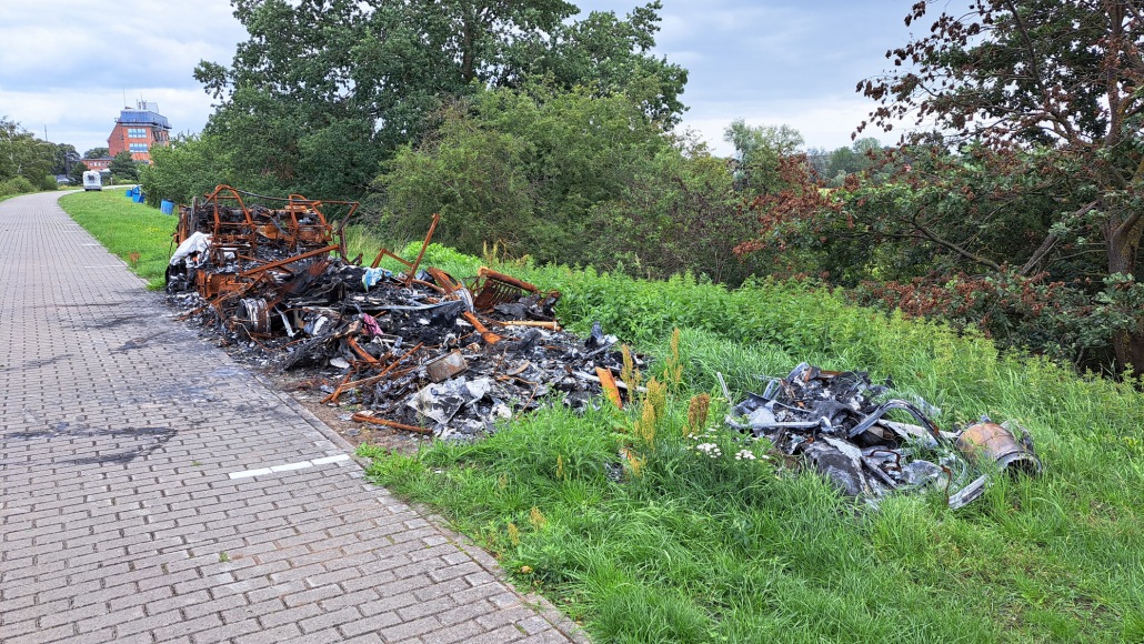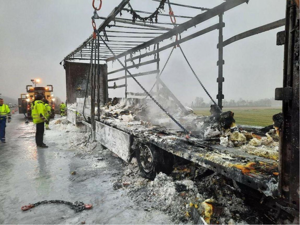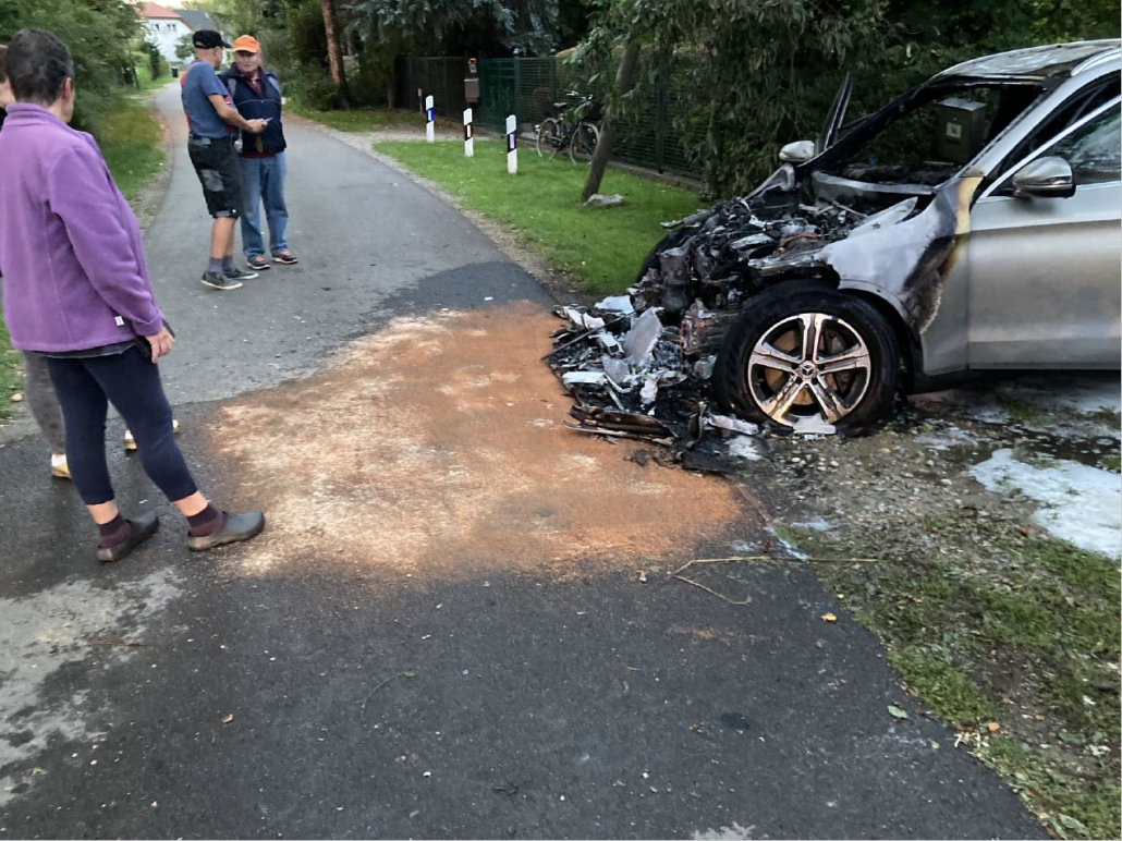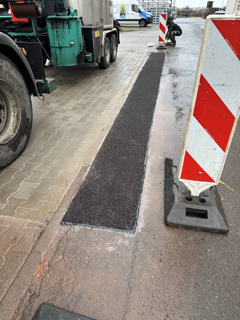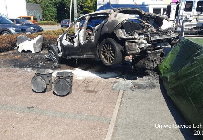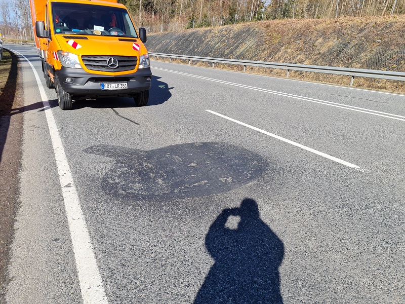 Brand-Schaden Elektrofahrzeug auf Teststrecke, Fahrbahn Sanierung und Löschwasserentsorgung